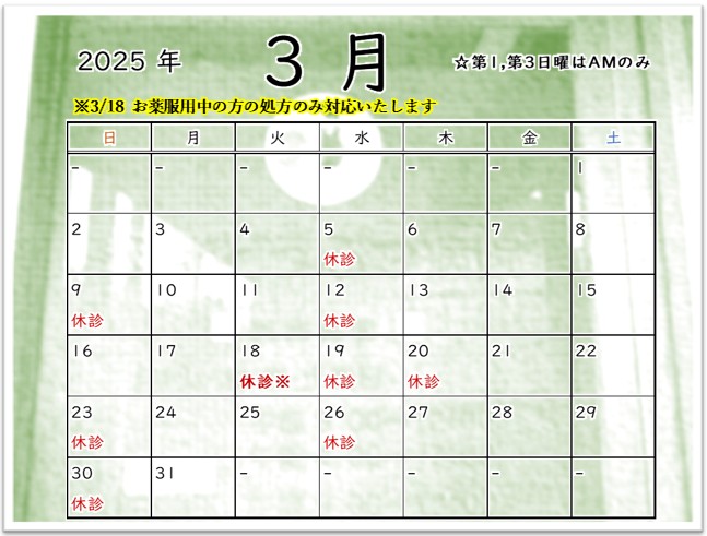 3/18(火)は休診日となりますが、お薬服用中の方につきましては処方のみ対応が可能です。