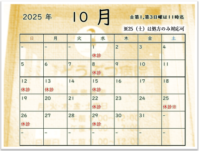 また、25日(土)は院長不在のため休診となりますが処方のみの対応は可能です。