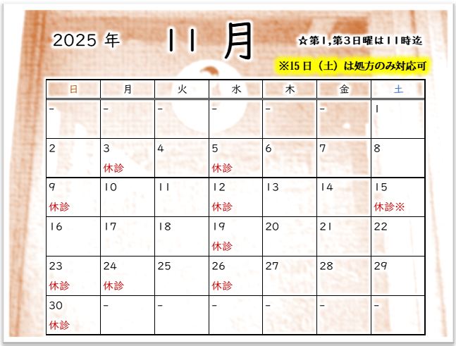 11月の休診日について 2025年10月23日 最終更新日時 : 2025年10月18日 永野どうぶつ病院 3日(月)と24日(月)は祝日のため休診となっております。 また、15日(土)は院長不在のため休診となっておりますが、処方のみ対応可能です。ご不明な点がありましたらお電話にてお問い合わせください。